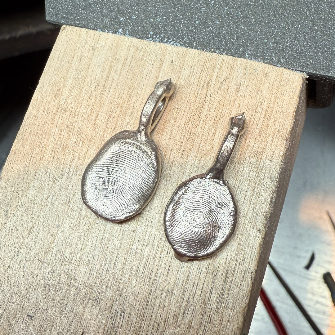 Size: Imprint charm measures approximately 10–12mm in diameter. Each piece is uniquely shaped by your individual wax impression — no two are ever the same.